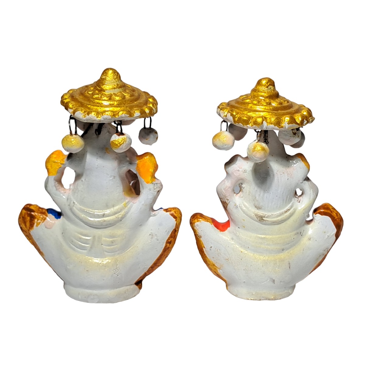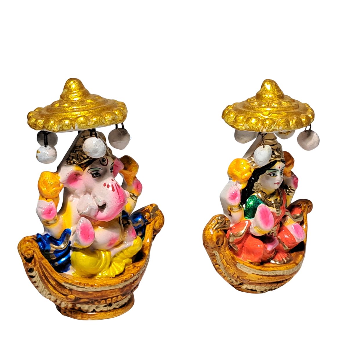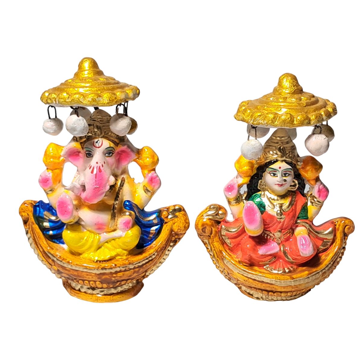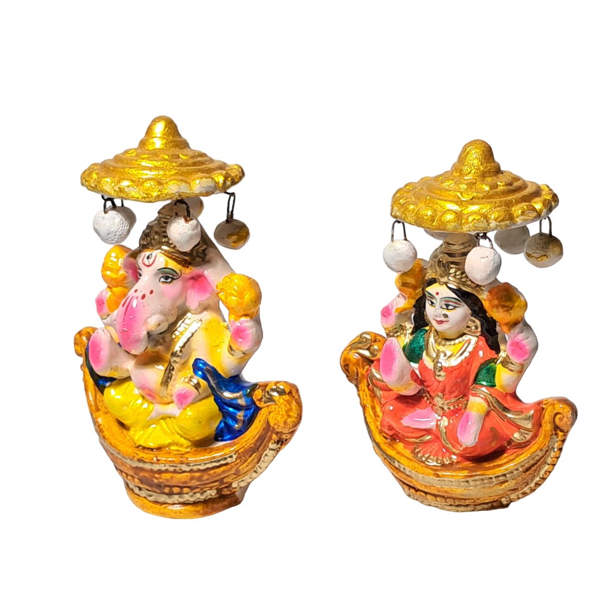 Each figurine is individually hand-molded and meticulously hand-painted, making every piece truly one of a kind. The vibrant color palette—highlighted with rich gold accents, soft pinks, warm yellows, and deep blues—adds a festive and elegant charm. The finely detailed expressions, traditional attire, and ornate headpieces reflect exceptional craftsmanship and devotion. The hanging umbrella-style canopy above each deity, adorned with small decorative beads, enhances the royal and celebratory appeal of the idols.