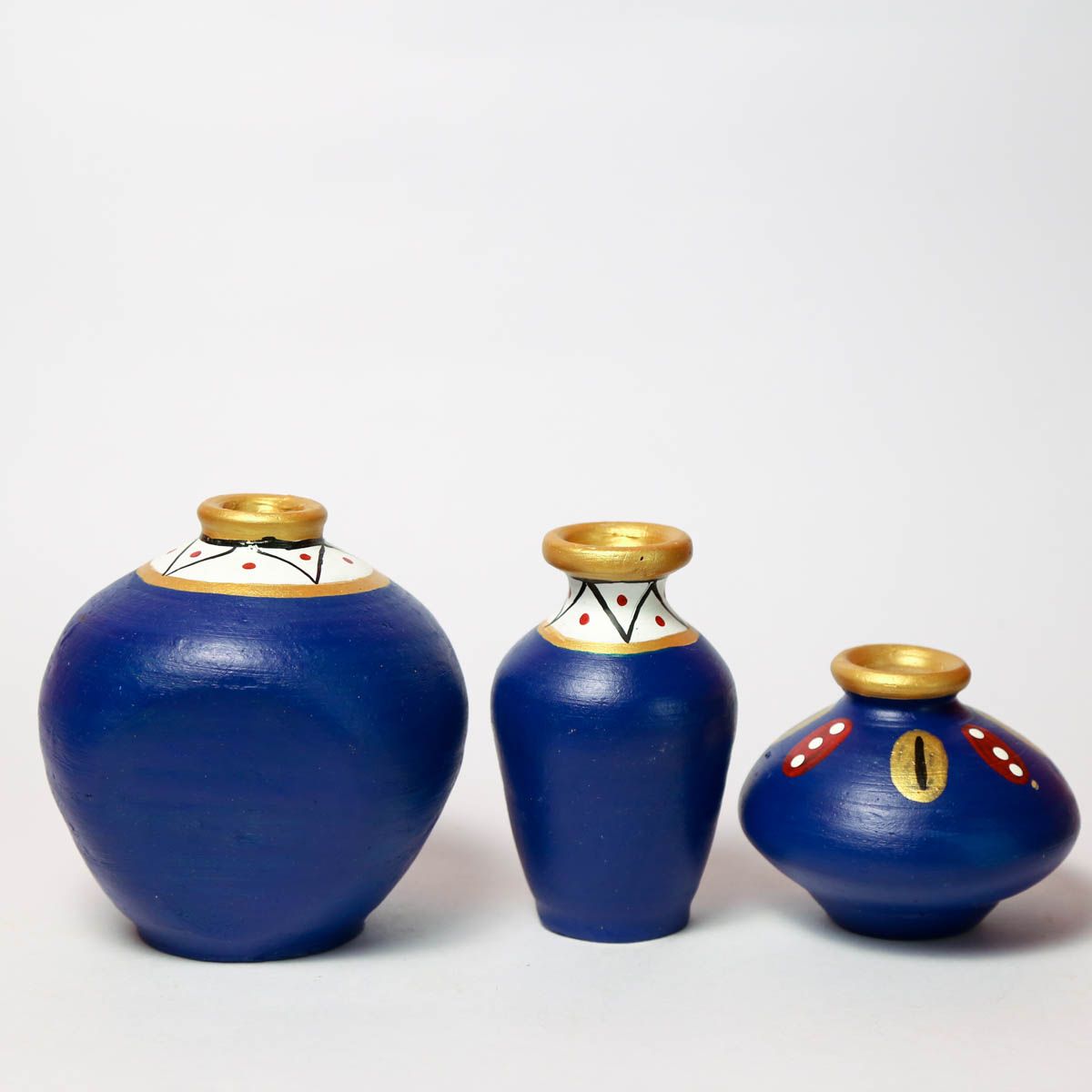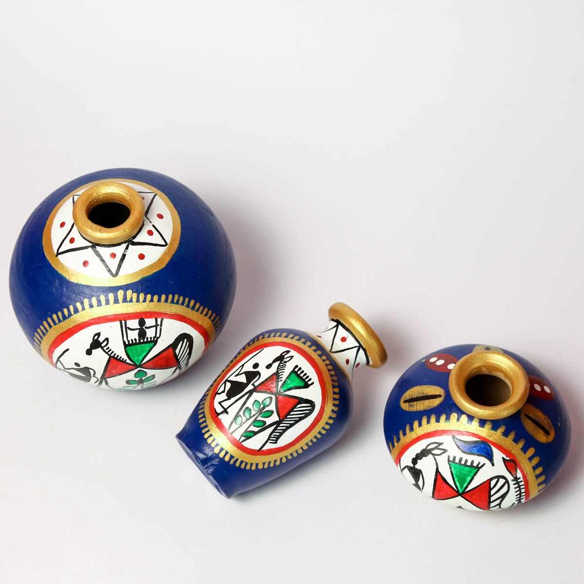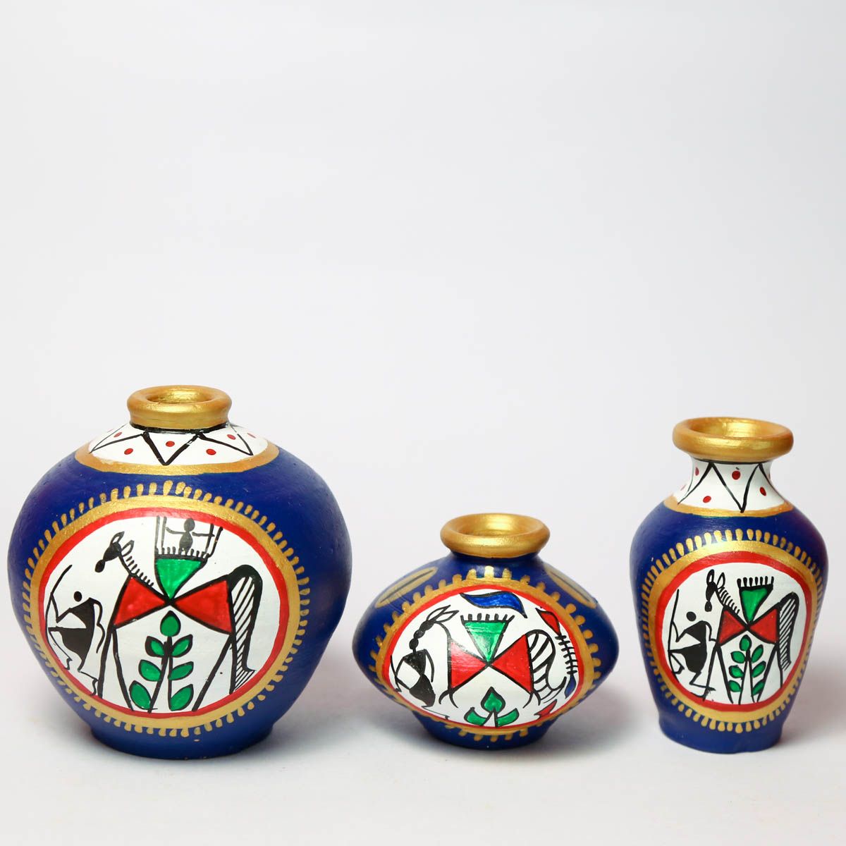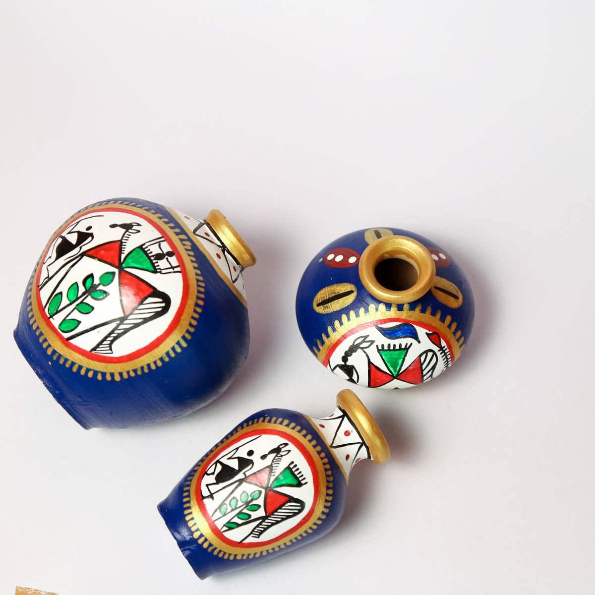 • Blue Warli Hand Painted Earthen Terracotta Pots (Set of 3 Pots)