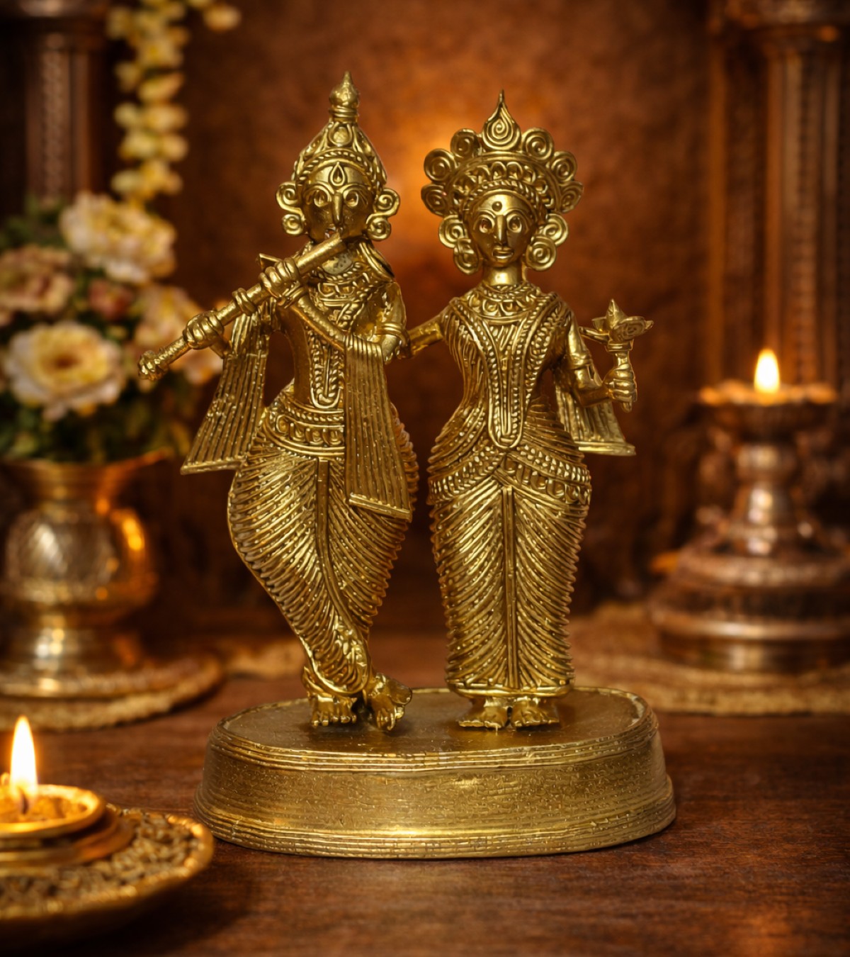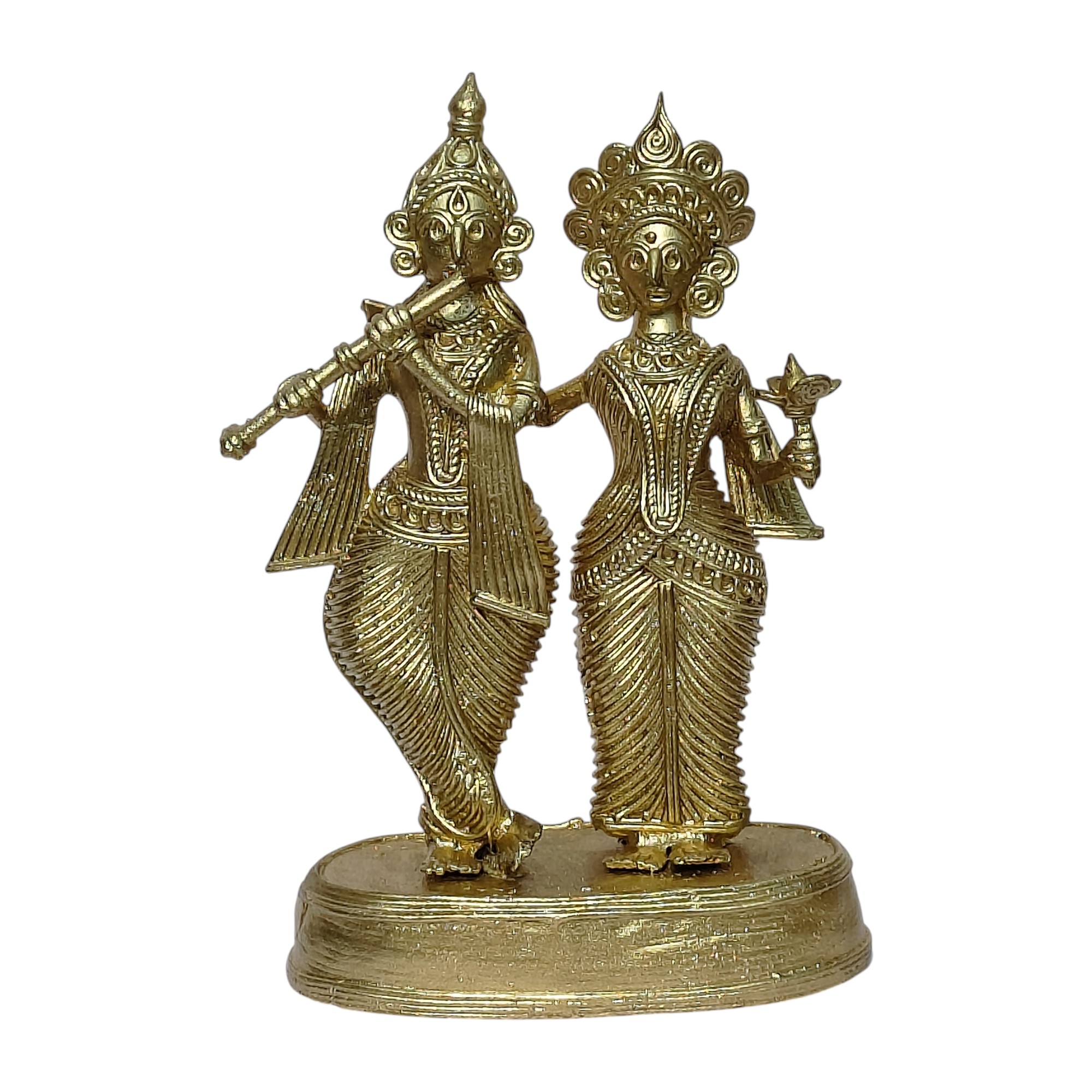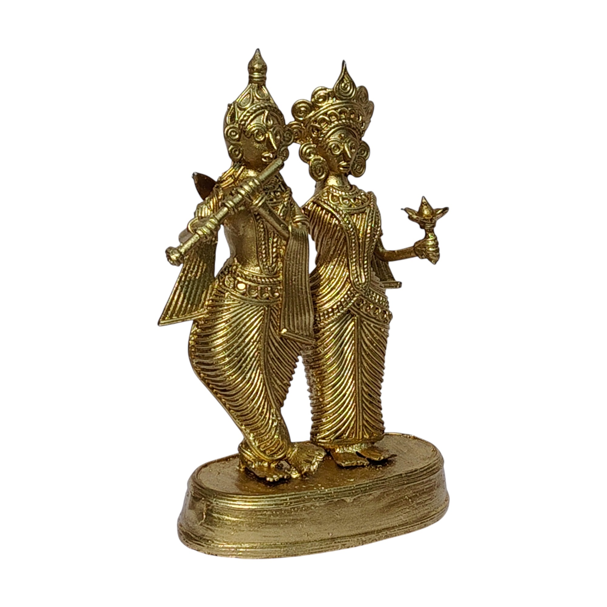 Rooted in the centuries-old Dhokra art tradition practiced by tribal artisans of India, this handcrafted masterpiece reflects exceptional skill, patience, and devotion. Every intricate detail—from Krishna’s elegantly poised flute to Radha’s graceful stance and ornate jewelry—has been thoughtfully sculpted to bring out the divine expressions and rhythmic movement of the figures. The delicate linear patterns, traditional attire, and beautifully designed crowns showcase the raw yet refined aesthetic that defines authentic Dhokra craftsmanship.