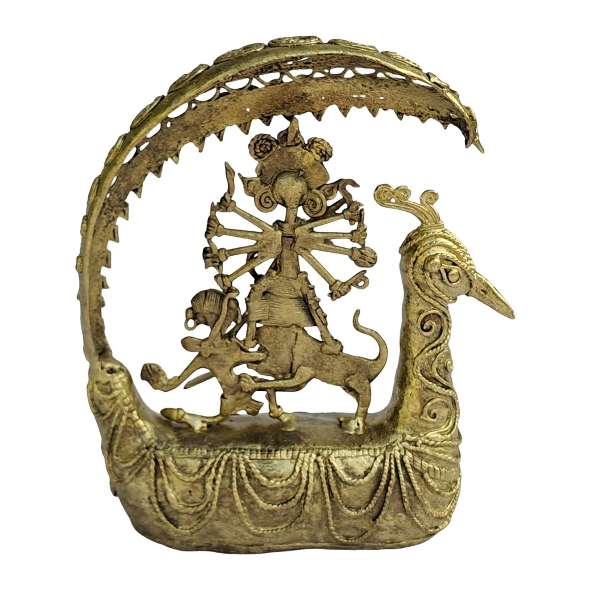 This Dhokra Mor Pankh Devi Durga Figurine is a stunning handcrafted brass sculpture created using the traditional lost-wax technique. Depicting Goddess Durga with her divine weapons and lion mount beneath a majestic peacock-inspired arch, it symbolizes strength, protection, and the victory of good over evil. With its intricate tribal detailing and antique finish, this piece adds spiritual elegance and cultural richness to any home or temple décor.
