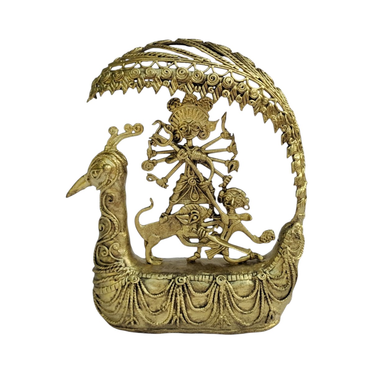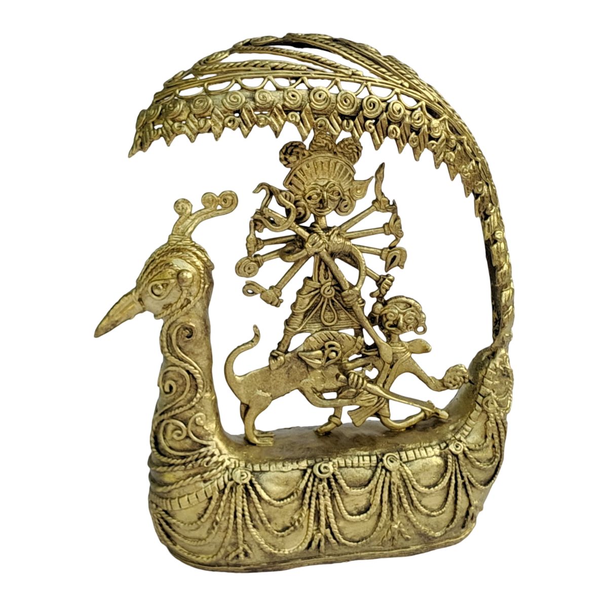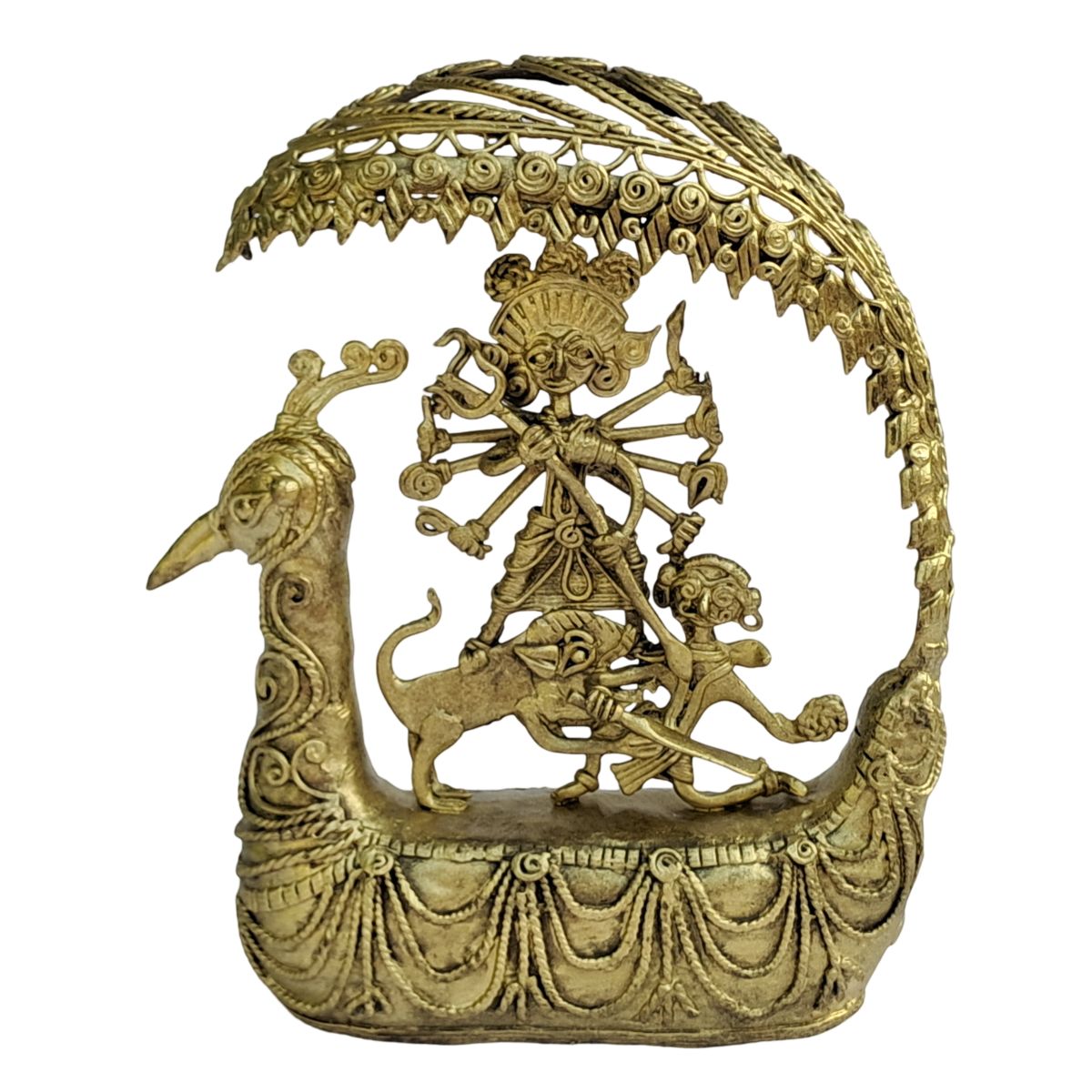 The figurine beautifully portrays Maa Durga with multiple arms holding her divine weapons, standing in a dynamic posture that reflects power and determination. The detailed depiction of her sacred lion mount represents bravery and authority, while the intricately designed peacock-inspired (Mor Pankh) arch above adds a majestic and artistic touch. The boat-shaped base with ornate carvings enhances the overall composition, giving the piece a grand and temple-like presence.