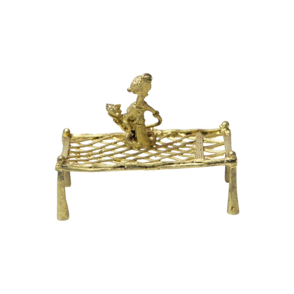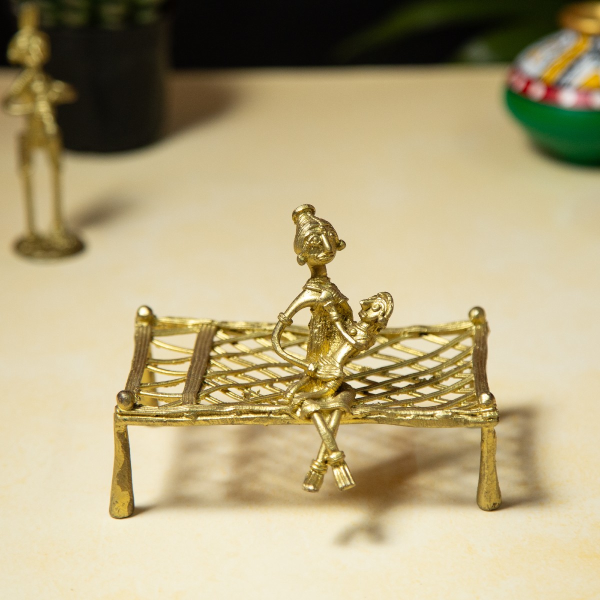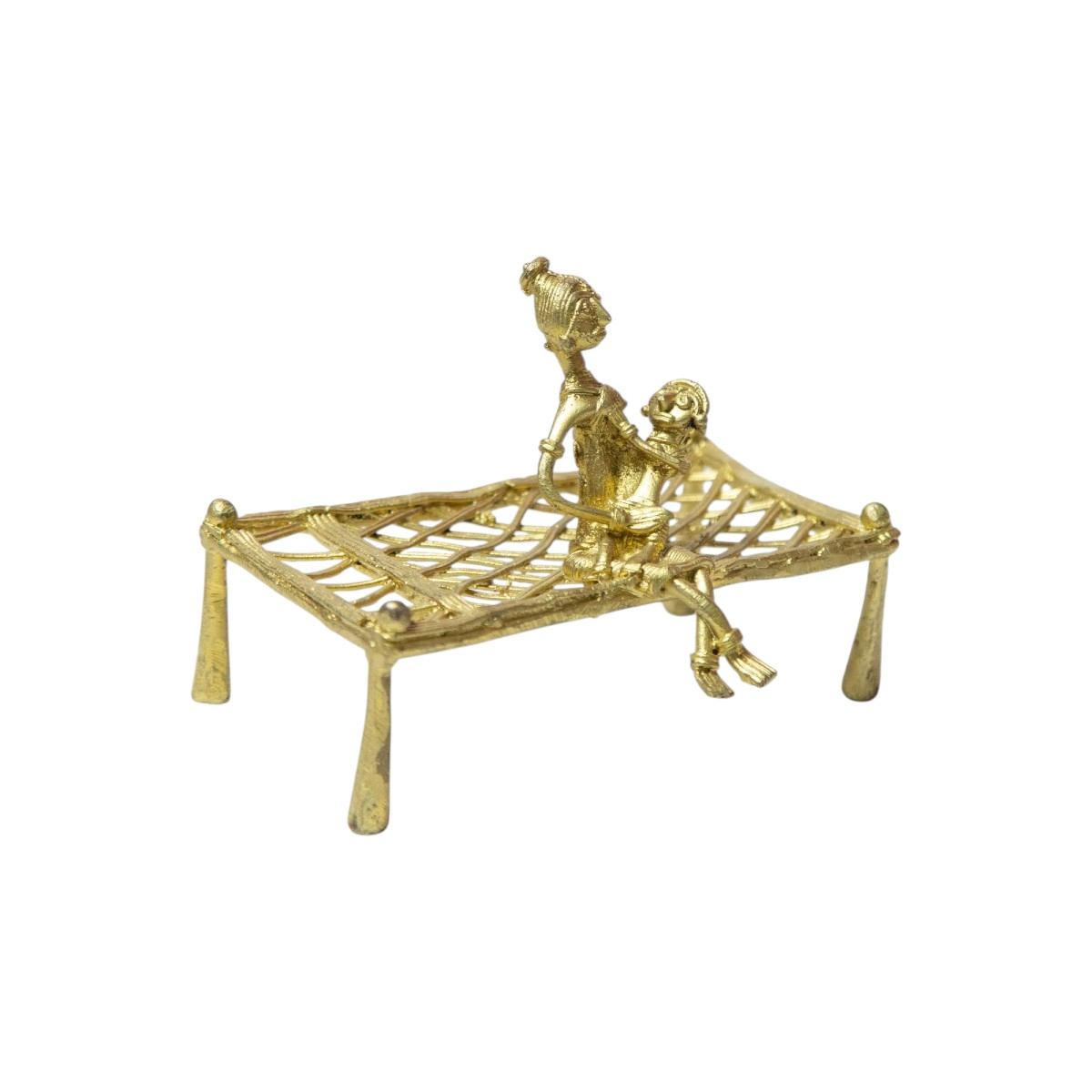 Celebrate the warmth of motherhood and the beauty of tribal craftsmanship with this exquisite Dhokra Mother Feeding Baby on Cot Showpiece. This heart-touching sculpture captures an intimate everyday moment—a mother lovingly feeding her child while seated on a traditional woven cot (charpai). The scene beautifully symbolizes nurturing care, protection, and the timeless bond between mother and child.