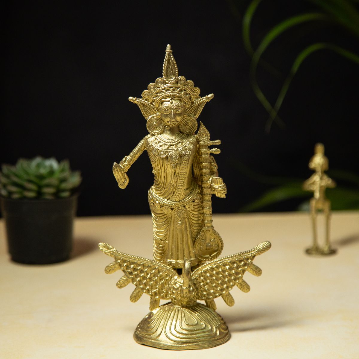 Honor wisdom, creativity, and divine knowledge with this exquisite Dhokra Saraswati – The Goddess of Learning Standing on Swan sculpture. This beautifully handcrafted piece portrays Goddess Saraswati, the revered deity of wisdom, music, arts, and education, gracefully standing upon her sacred vehicle, the swan (Hans), which symbolizes purity, discernment, and spiritual enlightenment.