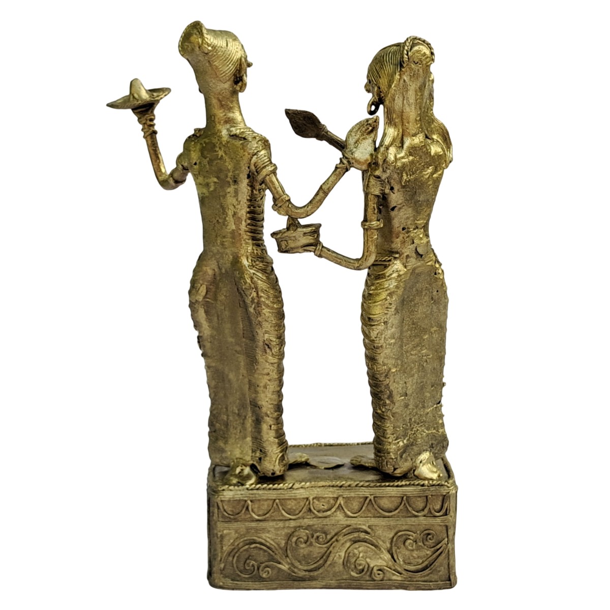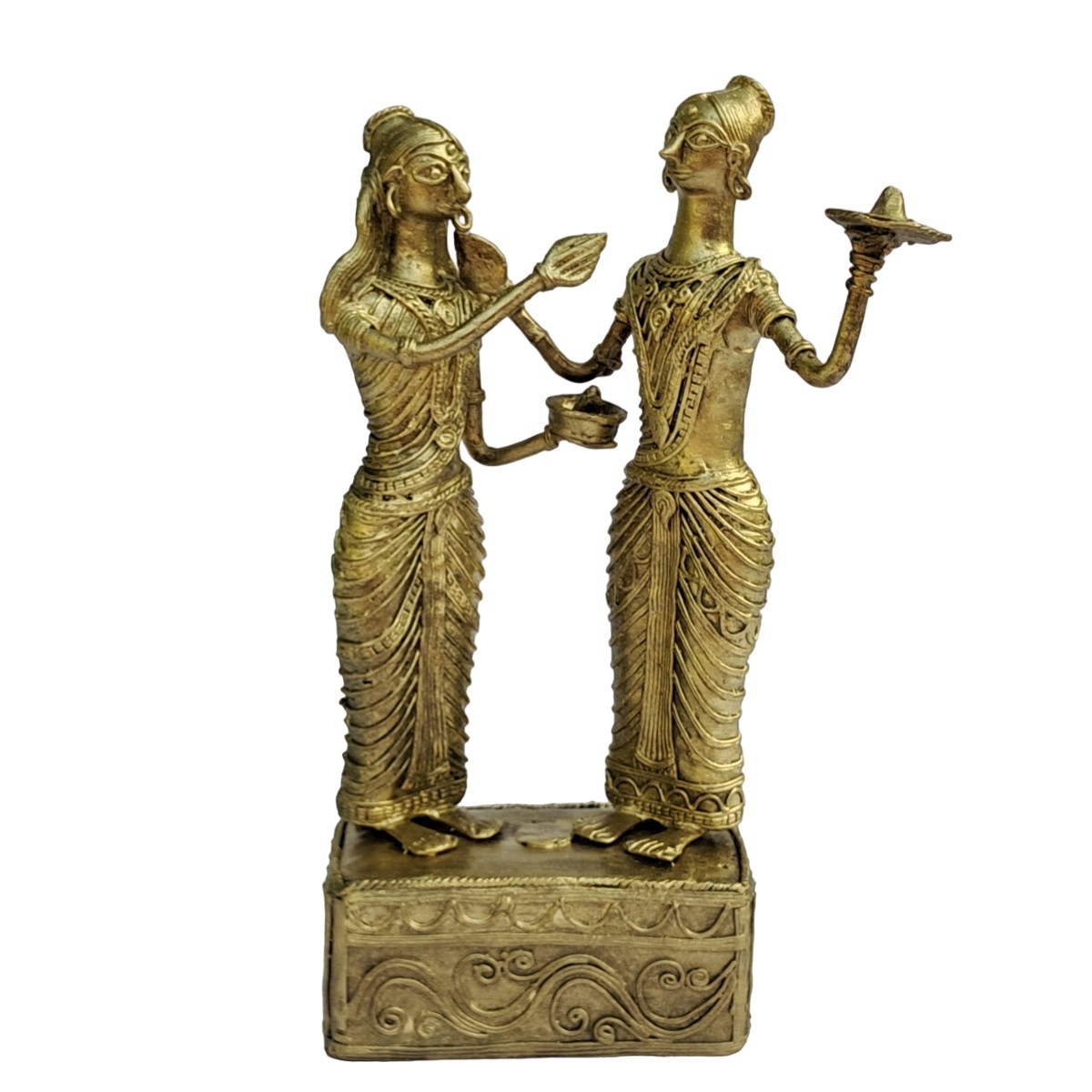 Crafted from high-quality brass using traditional Dhokra techniques, the showpiece features a distinctive antique golden finish with intricate tribal detailing. The elongated forms, expressive facial features, detailed jewelry patterns, and textured base highlight the raw yet refined beauty that makes Dhokra art unique. Its handcrafted nature ensures that no two pieces are exactly alike, making each sculpture truly one-of-a-kind.