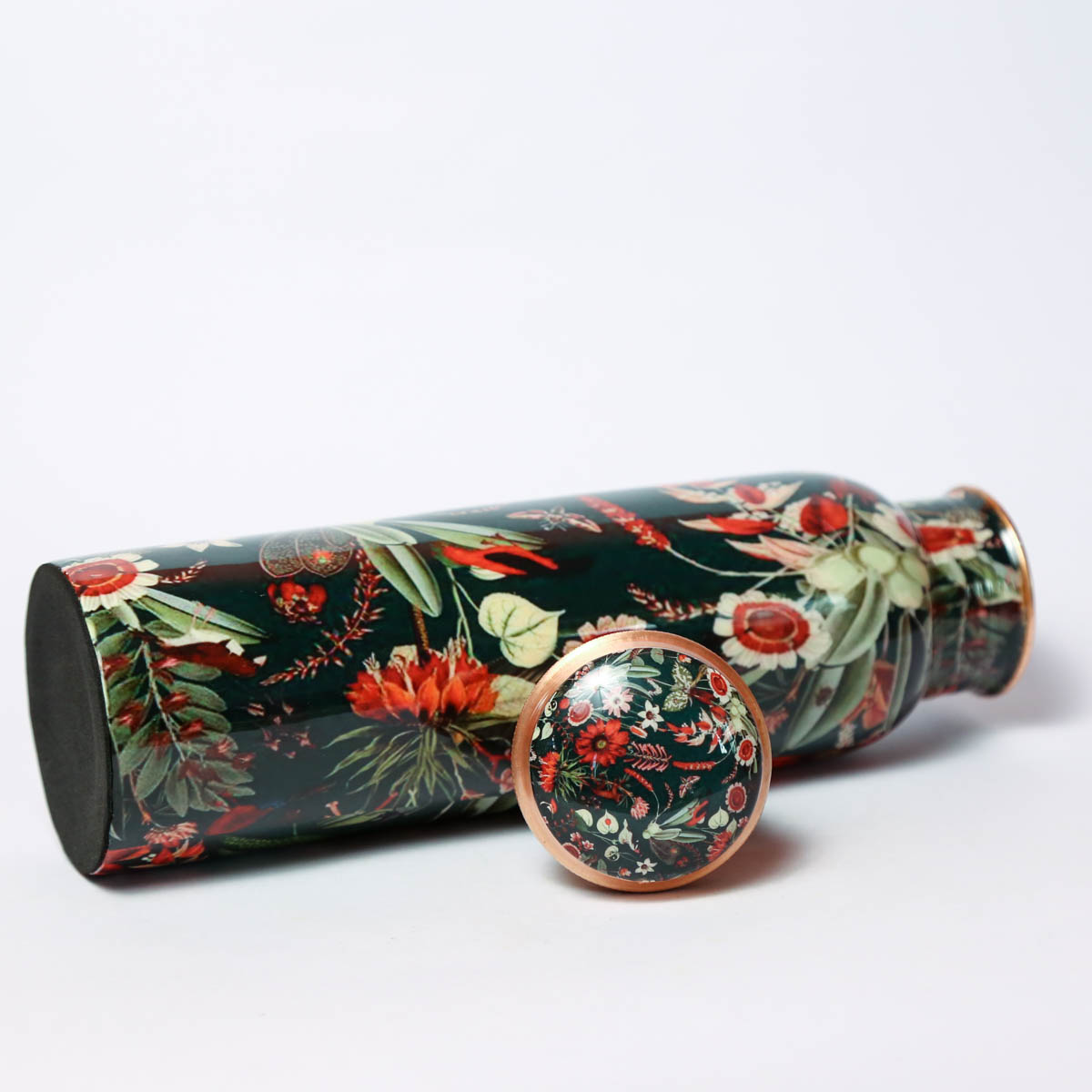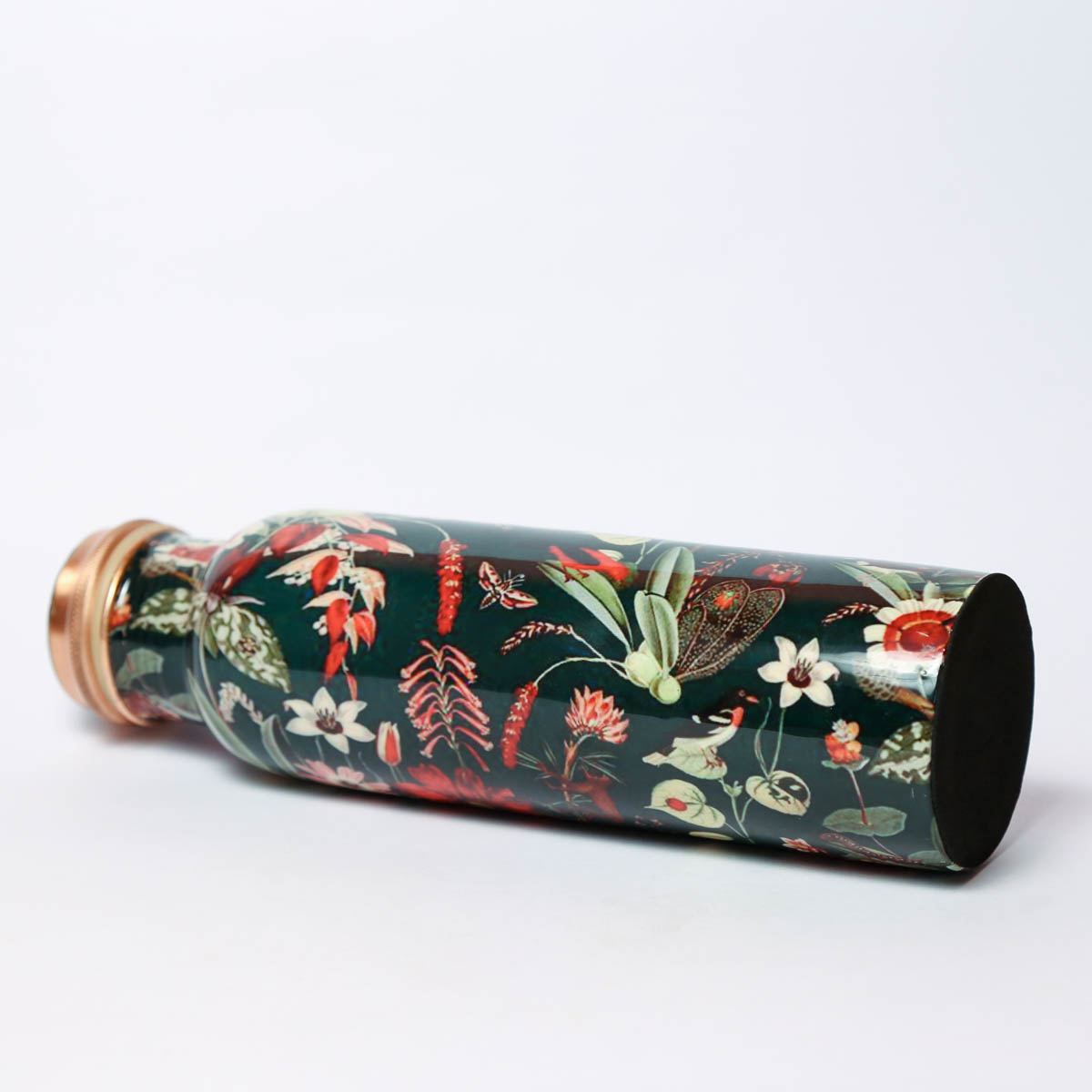This design on this copper bottle is hand printed. So, there might be slight variation of color and design which are natural in the manufacturing of hand made items.