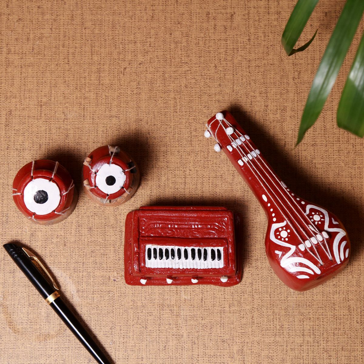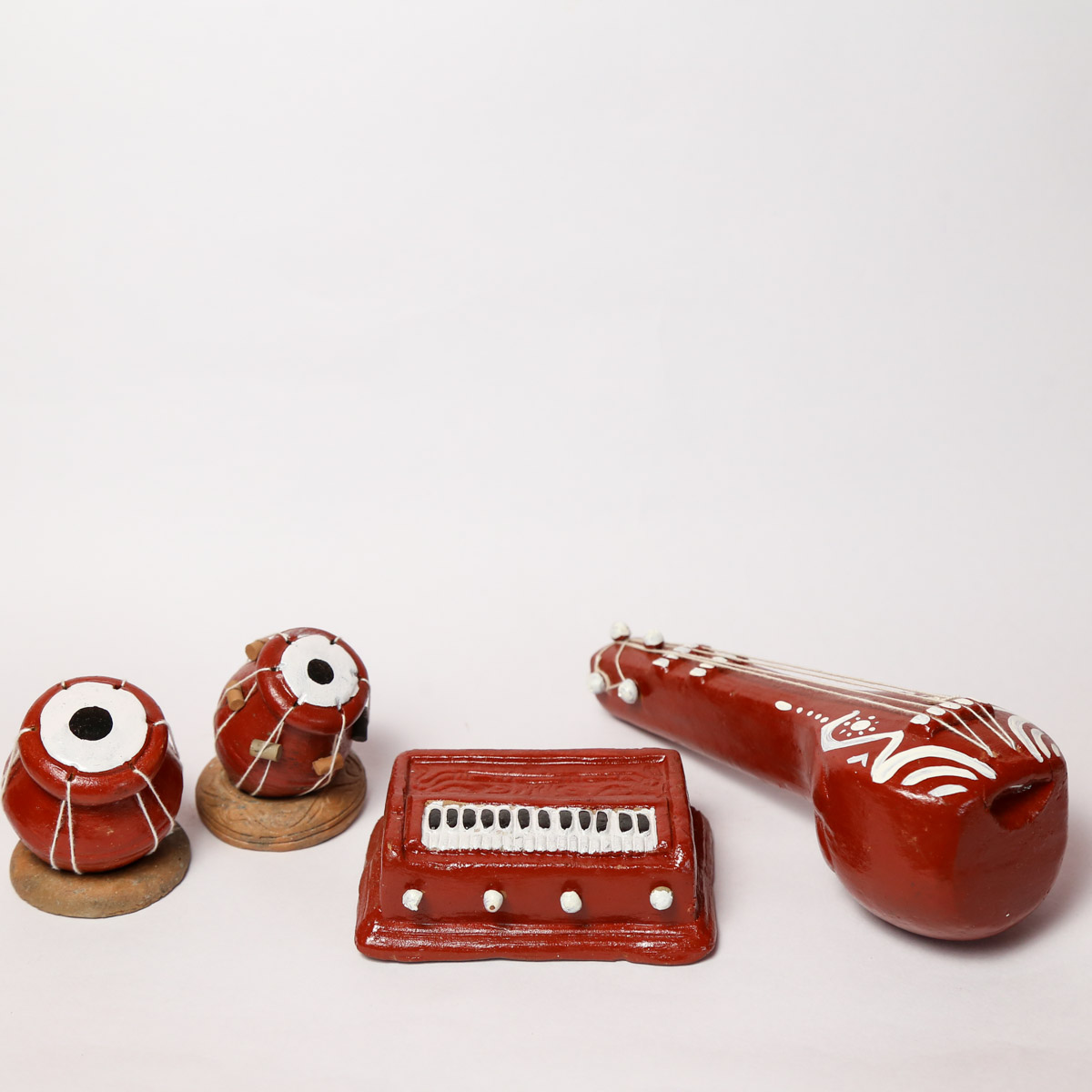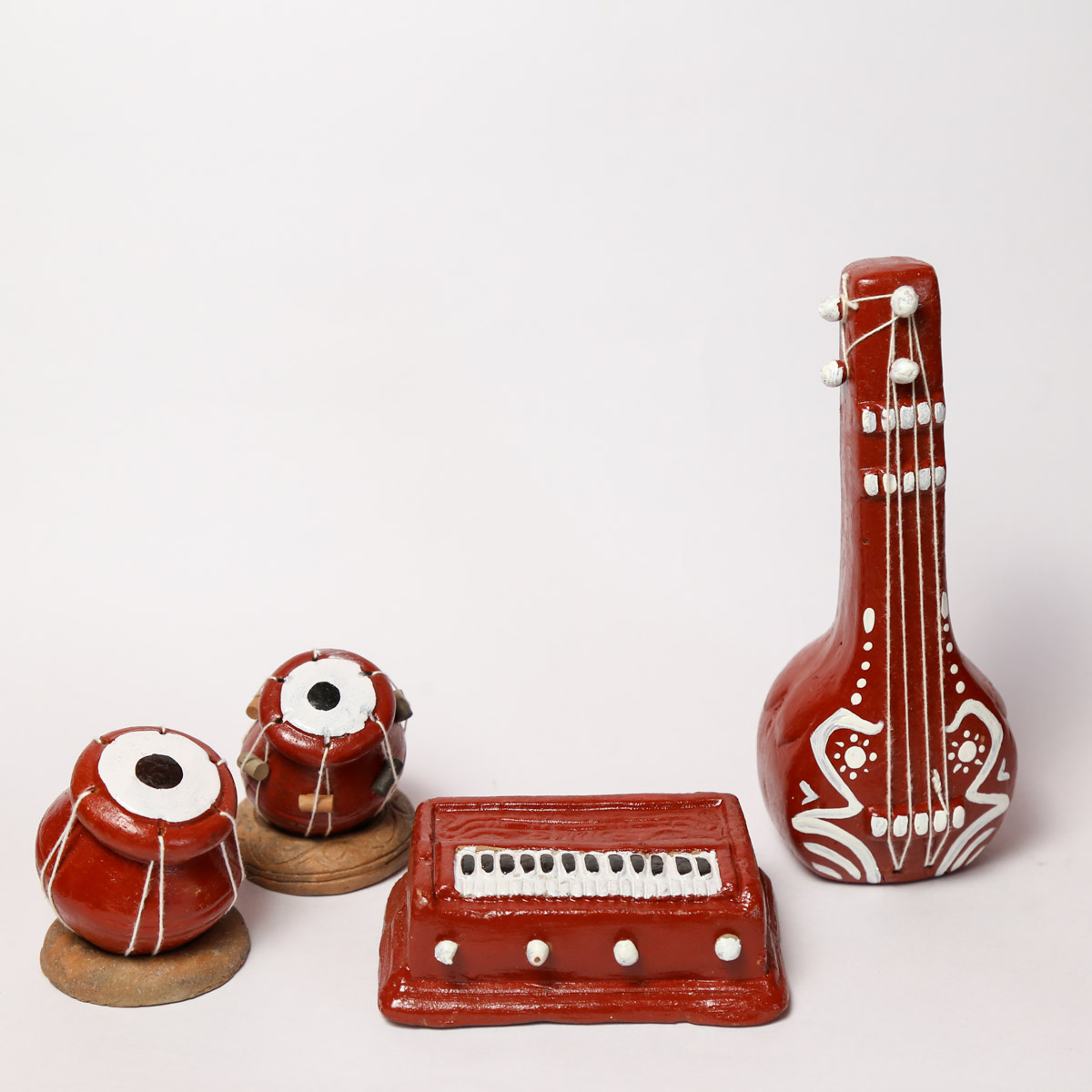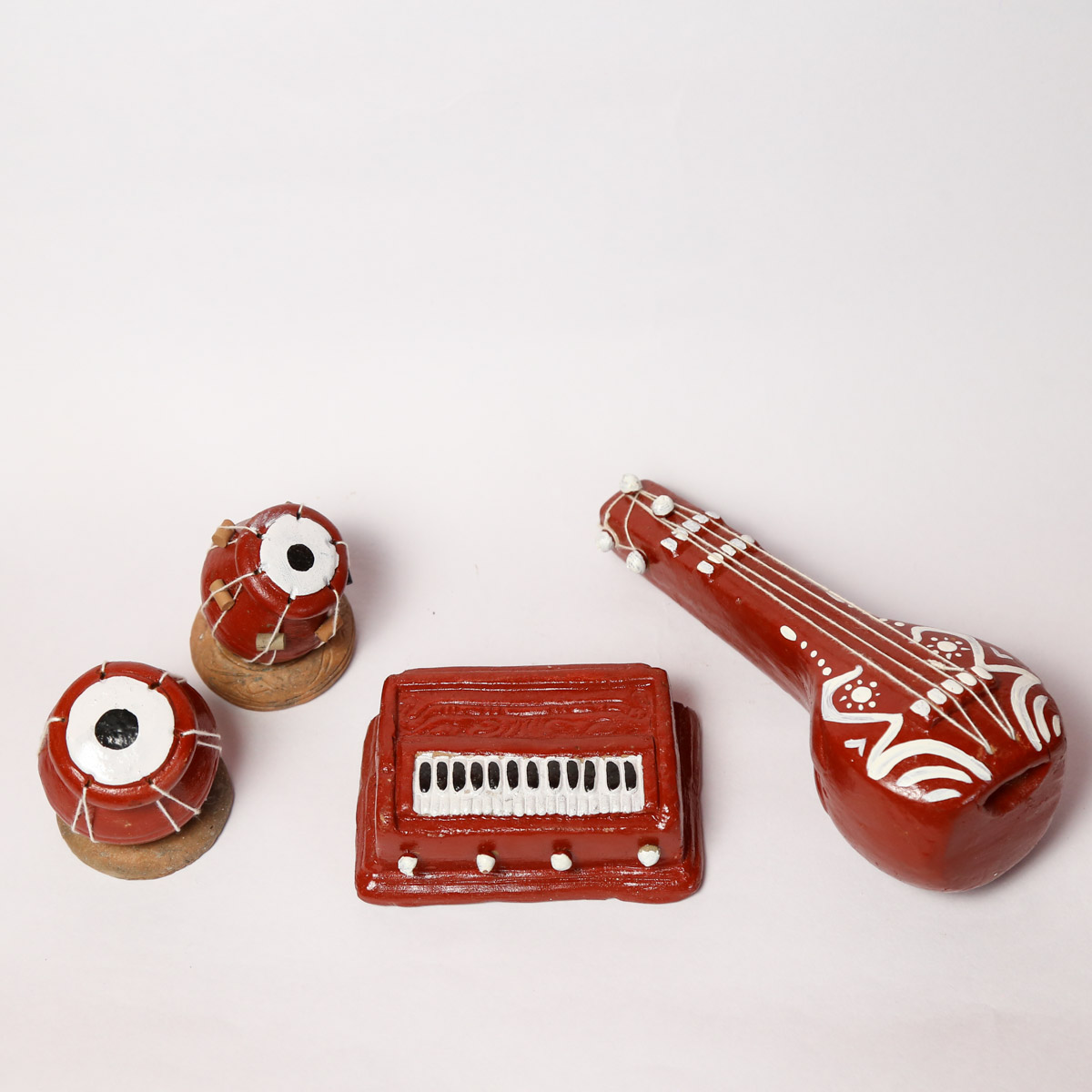 Music has always been an integral of every Indian life. The music of India includes Indian classical music, folk music and these musical instruments are used to create melodious sound in the music. The clay work radiates the rustic beauty of our life system and our great artisans has made this miniature form of musical instruments with their hard work and passion. Tabla, a pair of hand drum, has been a principal musical instrument from ancient times in Indian classical music. The another one is Harmonium has been originated in India in the rule of British. Harmonium is a free reed keyboard instrument which produces sound when air enters into it through pressure. The keys of the Harmonium are so beautifully crafted, looks like the real ones. The tanpura is a long-necked string instrument, originating from India, has been used in various forms of Indian music. It does not play melody but supports the melody of another instrument or singer by providing a continuous harmonic bourdon. Tanpura acts as the reference chord in Indian classical music. This handmade showpieces is the perfect blend of clay art and our daily aesthetics. This will leave your loved ones mesmerized with the intricate art work.