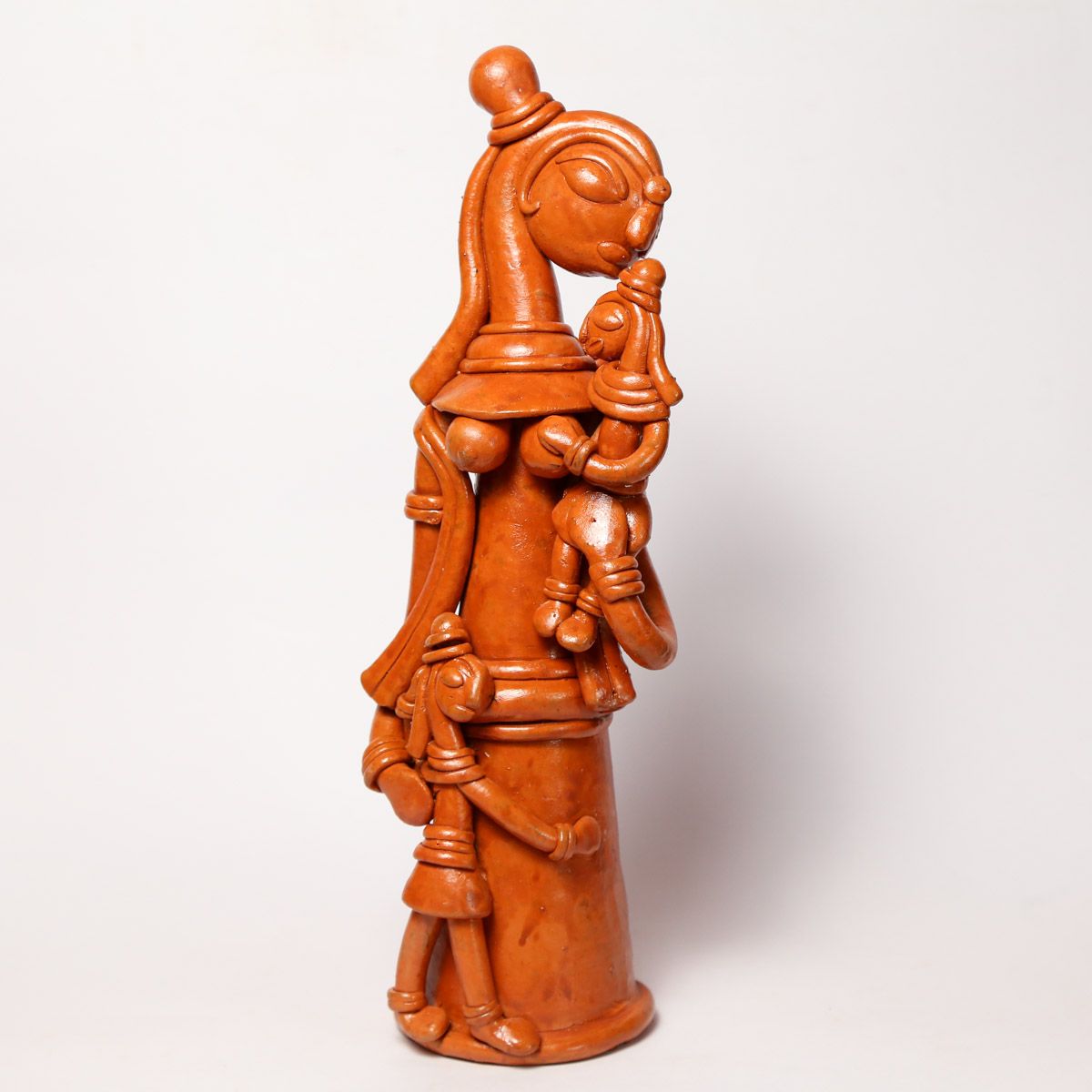 The essence of this beautiful and magnificent terracotta statue of an Indian Mother embracing her children with love and affection statue will not only enrich the beauty of your living spaces, gives an exotic feeling with its traditional form. This showpiece is the manifestation of our age-old tradition of creating terracotta sculptures by our rural artisans with their charismatic skills. A minor organic variation and slight deviation while hand crafting would enhance the uniqueness and make the product more appealing.