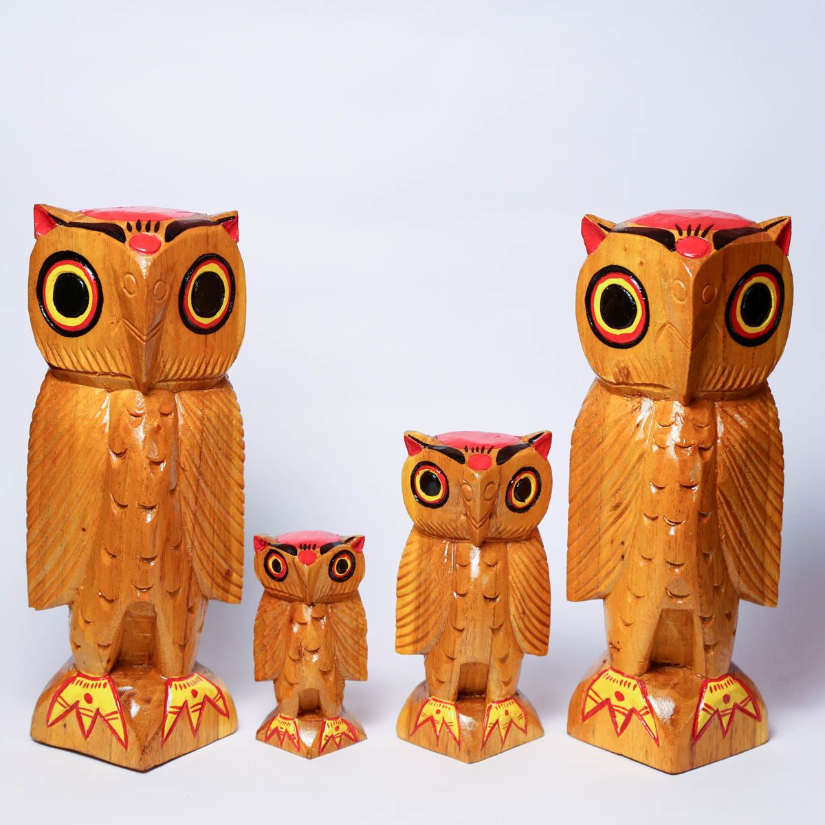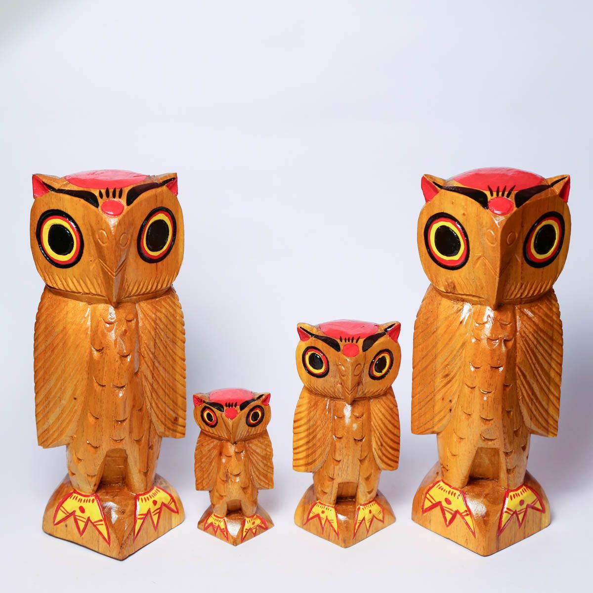 In the serenade of the black splash of the sky, the luminous stars decorated across the ocean of darkness, the nocturnal owl sits majestically as the moonlight guide its way in the dark. This wooden owl is a tribute to a creature that holds spiritual and cultural symbolism of nation. This intricate wooden curving is done by our skillful artisans of village Natungram where journey starts from wooden art & craft and ends in bringing the positivity and wisdom at your home. Usually men in the family chisel the single block of wood to create the figurines and women make those owl magically beautiful by putting bright color on it. This Owl Family set will add a essence of uniqueness at your living room.