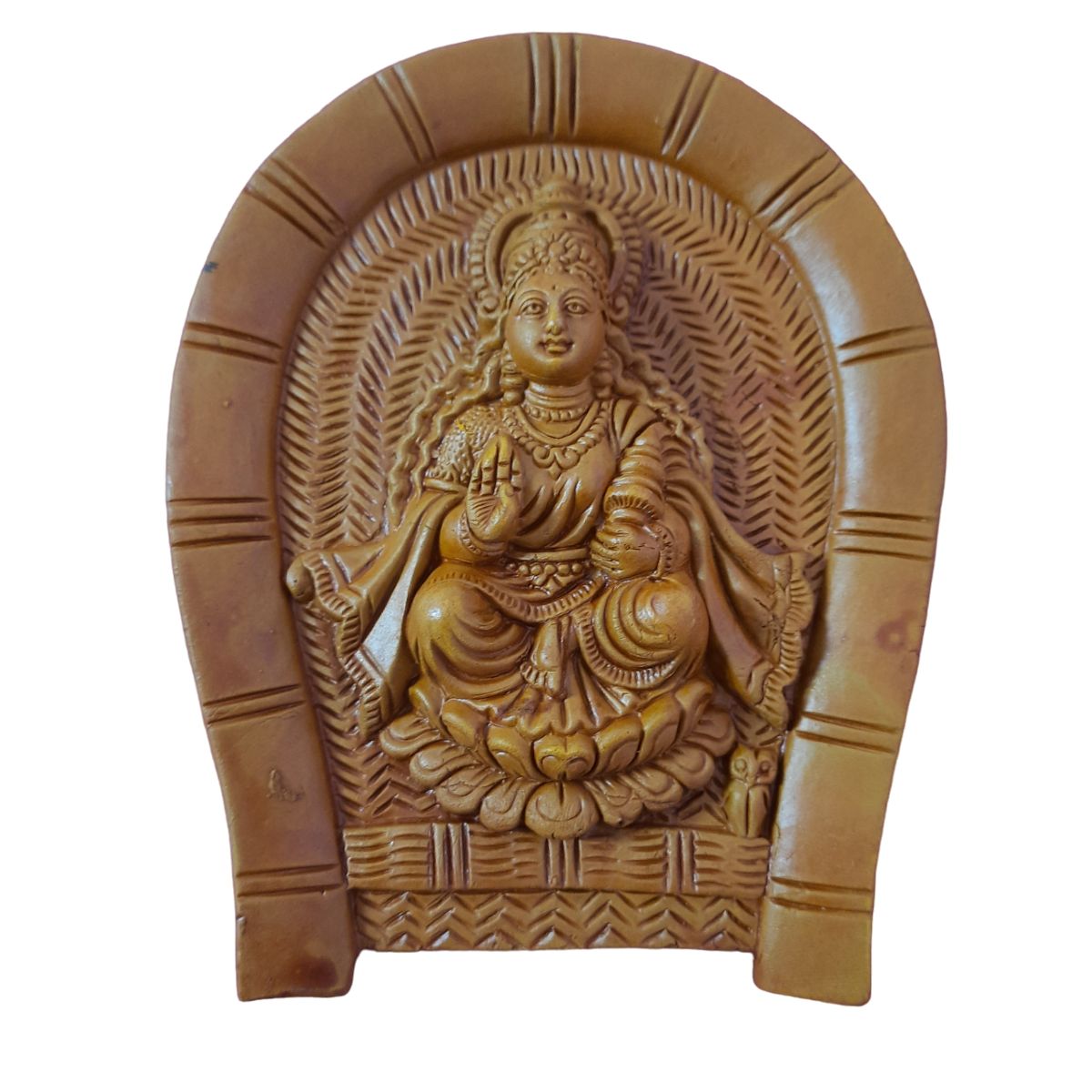 Lakshmi is the Goddess of wealth, prosperity and fortune. Lakshmi is worshipped everyday in almost all Indian house. Goddess Lakshmi is associated with Lotus flower and our great Indian Artisans has crafted this beautiful wall hanging Lakshmi in the popular art form of Bengal, terracotta. Its simple and compact design brings the earthiness of Indian culture.