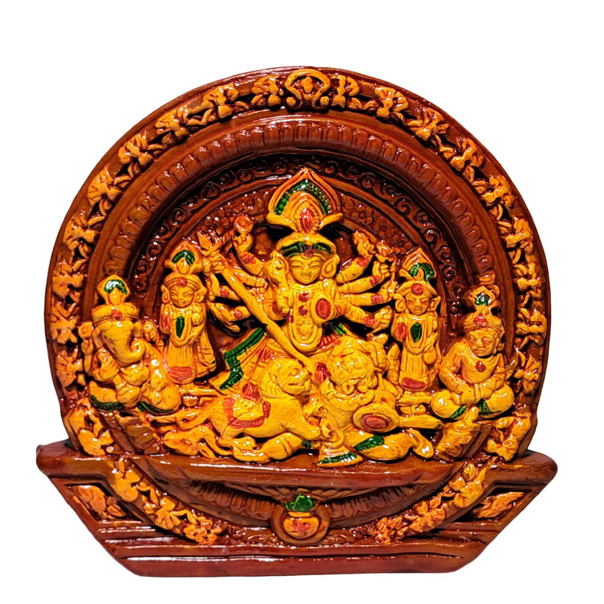 Goddess Durga is the protective mother of the universe. Goddess Durga symbolizes the divine forces that is used against the negative forces of evil. Maa Durga is elegantly dressed woman standing on her vahana Lion with 10 arms, each holding the special weapon of one of the gods, who gave them to her for her battle against the buffalo demon, Mohishashur.The image of Maa Durga in Bengali rituals is totally different than any other form of Goddess Durga. Durga Puja held once in a year and it is one of the greatest festivals of Bengal. It is believed that Maa Durga is the daughter of Himalaya and she comes to her father’s place once in a year with her children – Kartik, Ganesh, Saraswati and Lakshmi. This Durga Family idol depicts that Maa Durga shows lots of love and compassion on her children. The essence of this beautiful and magnificent terracotta statue will not only enrich the beauty of your prayer room and when placed in living spaces, gives an exotic feeling with its traditional form. A minor organic variation and slight deviation while hand curving would enhance the uniqueness and make the product more appealing.