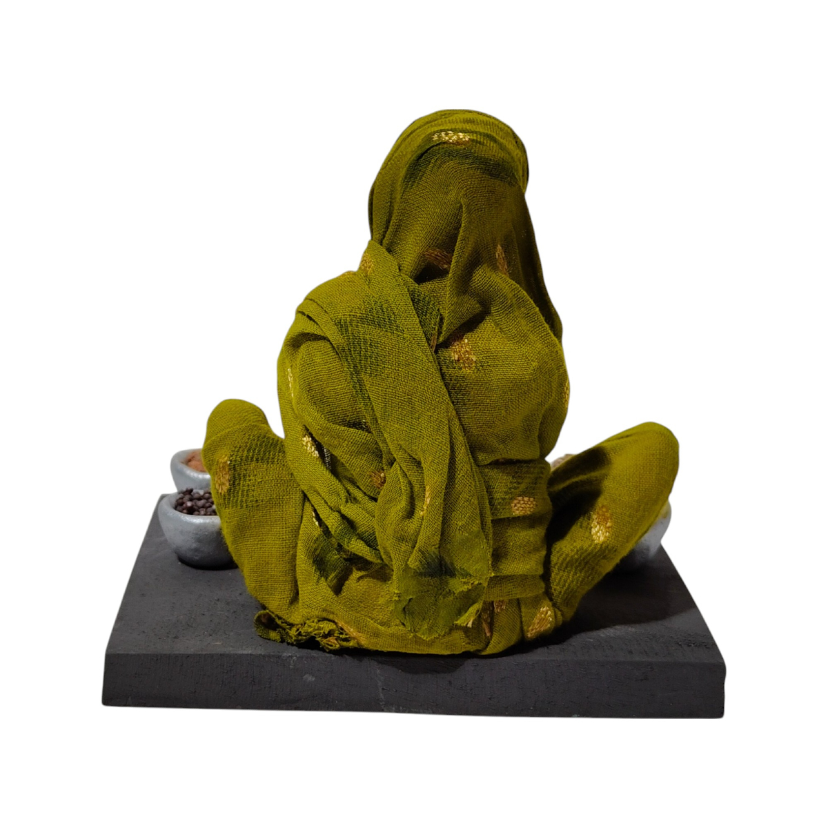 Carefully crafted by skilled artisans, the figurine beautifully reflects everyday life in Indian villages where fresh spices are prepared by hand. The woman is dressed in a traditional green saree with delicate detailing, and her calm expression adds warmth and authenticity to the piece. Surrounding her are small bowls filled with different spices, thoughtfully designed to highlight the essence of traditional cooking methods.