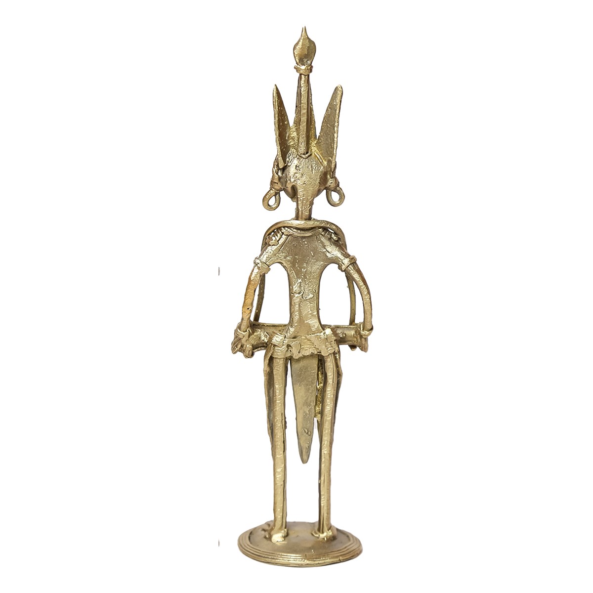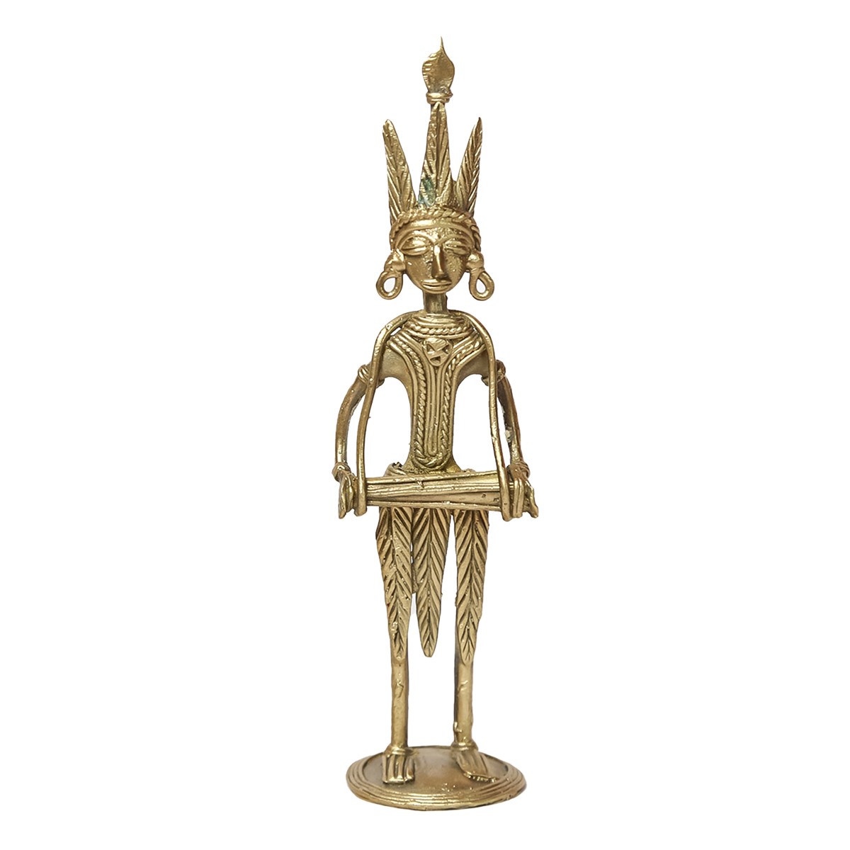 This tribal musician playing Madol draws the inspiration from the tribal life of the eastern part of India and our great Dhokra artisans has made this figurine with love and care . This showpiece comes in golden color with antique finish and 100% handmade using the lost-wax casting technique. This Musician figurine depict the saga of Indian rich cultural heritage and legacy primitive metal craft work. This intricate art form will spread the magnificent rhythms and liven up your living room with its ethnic natural beauty.