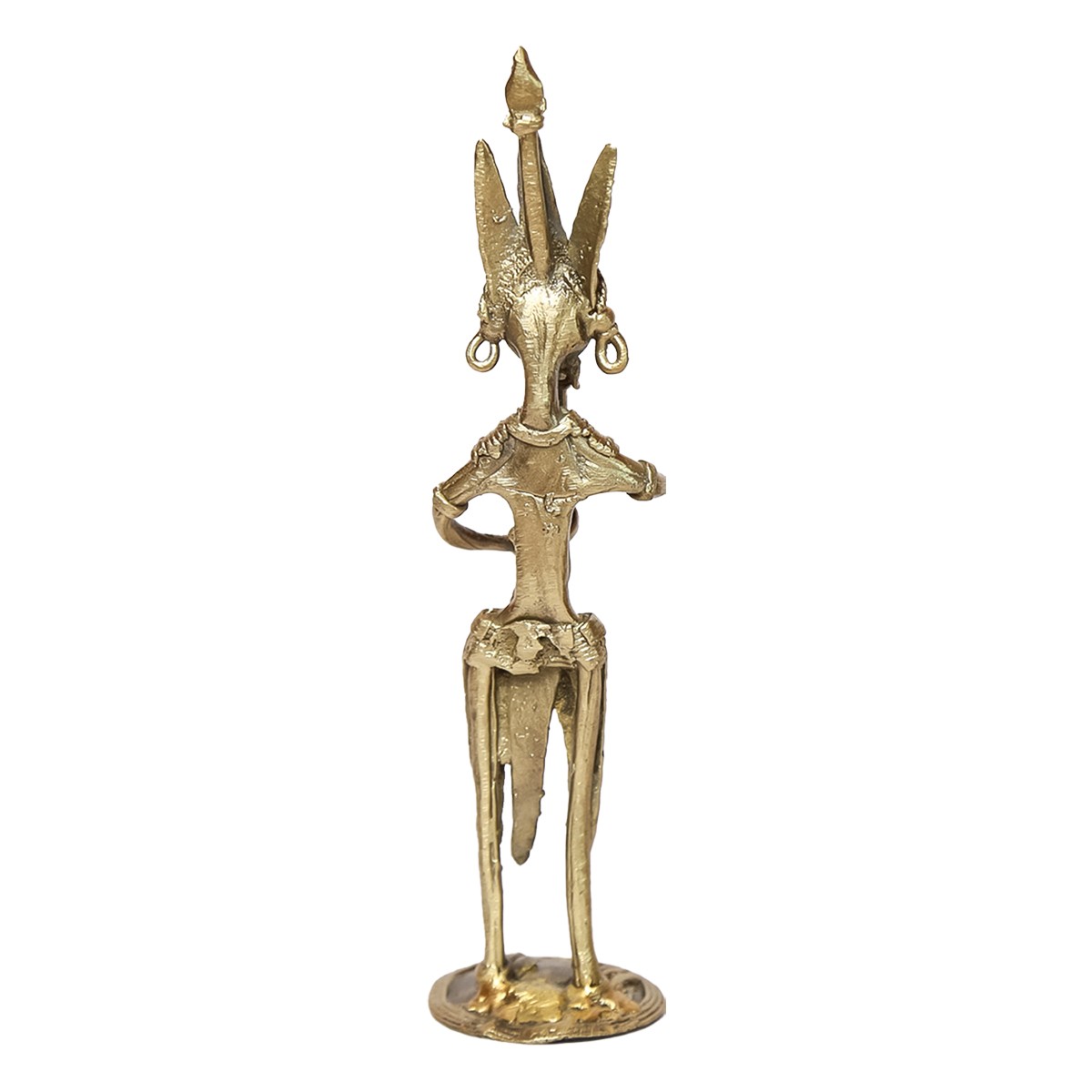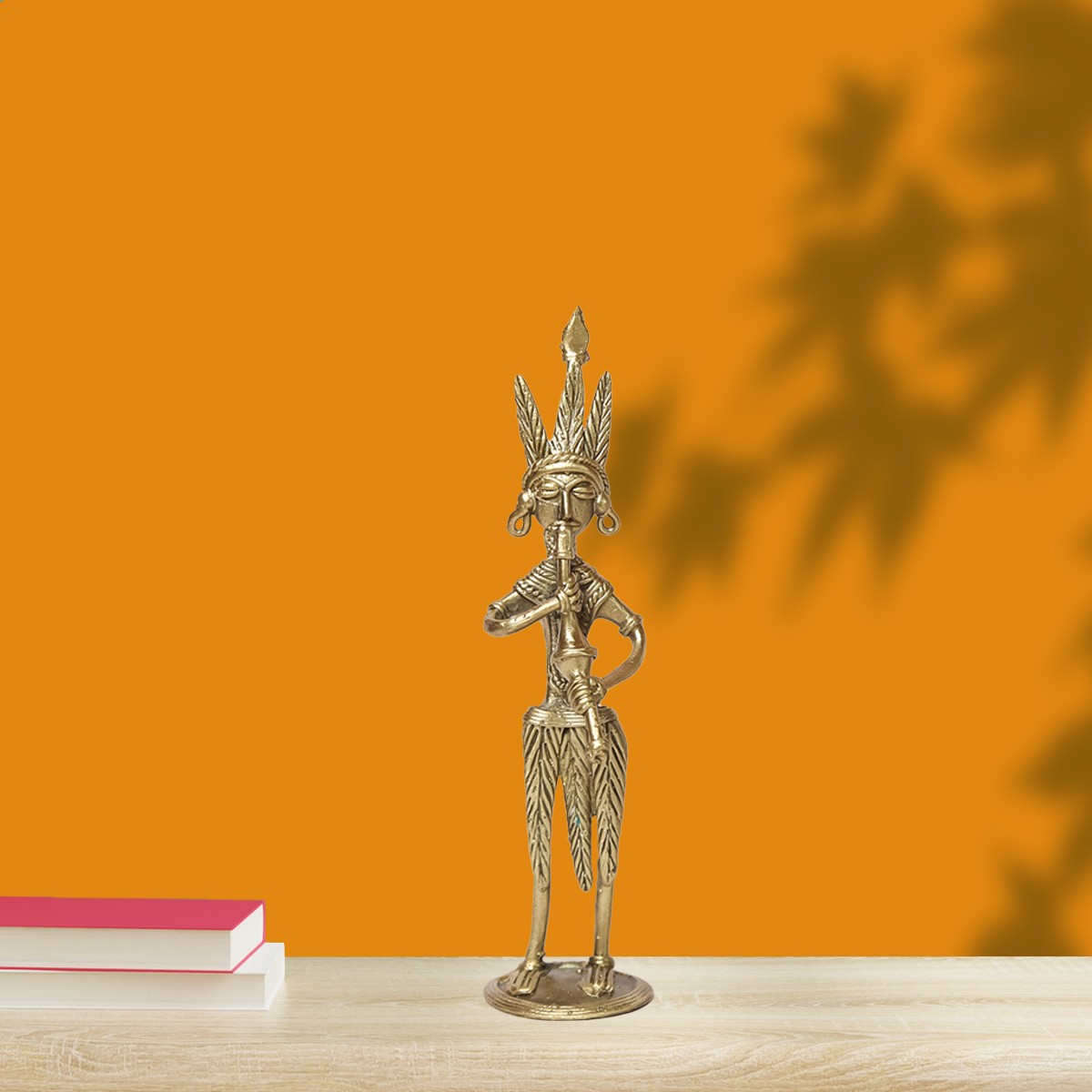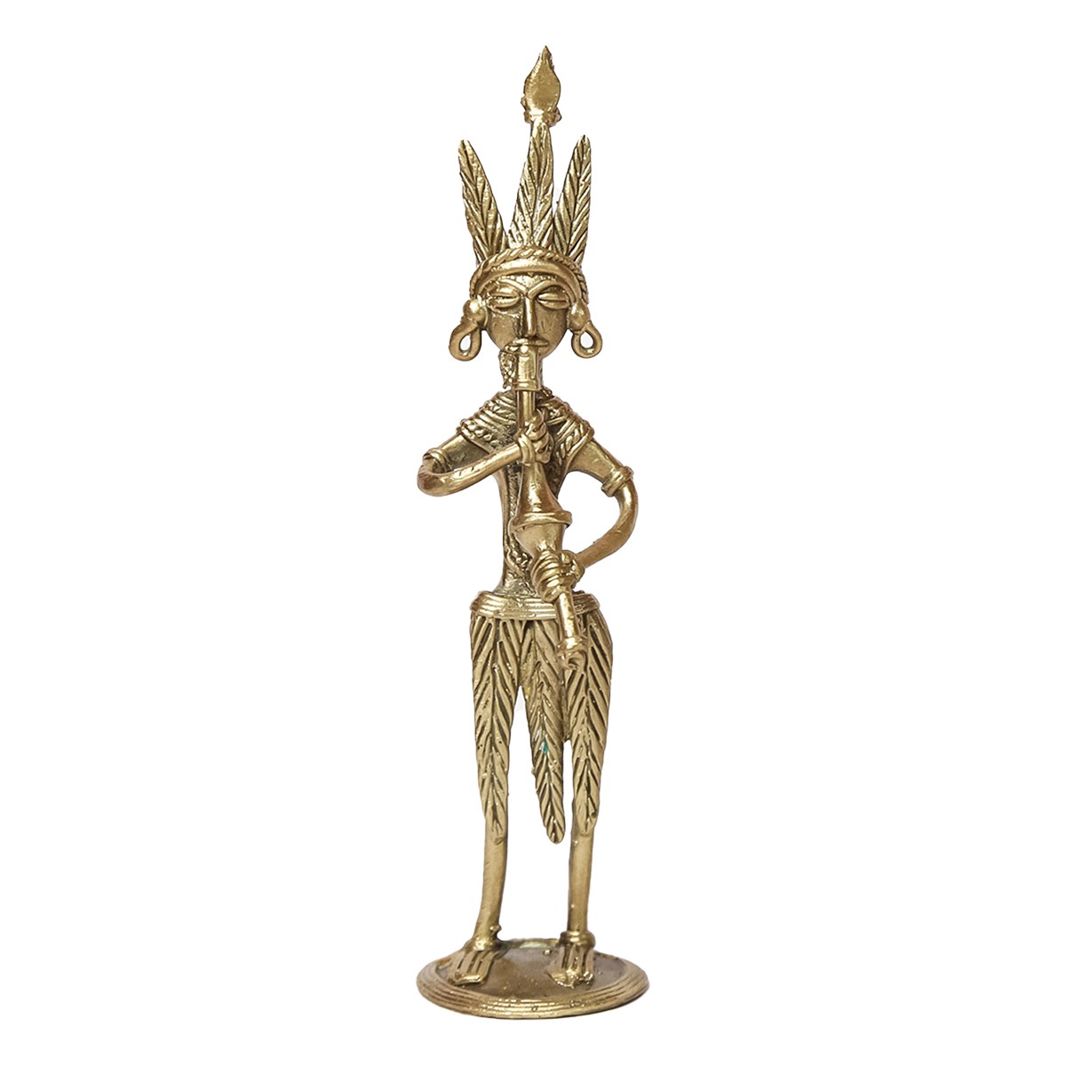 This tribal musician playing Piper draws the inspiration from the tribal life of the eastern part of India and our great Dhokra artisans has made this figurine with love and care . This showpiece comes in golden color with antique finish and 100% handmade using the lost-wax casting technique. This Musician figurine depict the saga of Indian rich cultural heritage and legacy primitive metal craft work. This intricate art form will spread the magnificent rhythms and liven up your living room with its ethnic natural beauty.