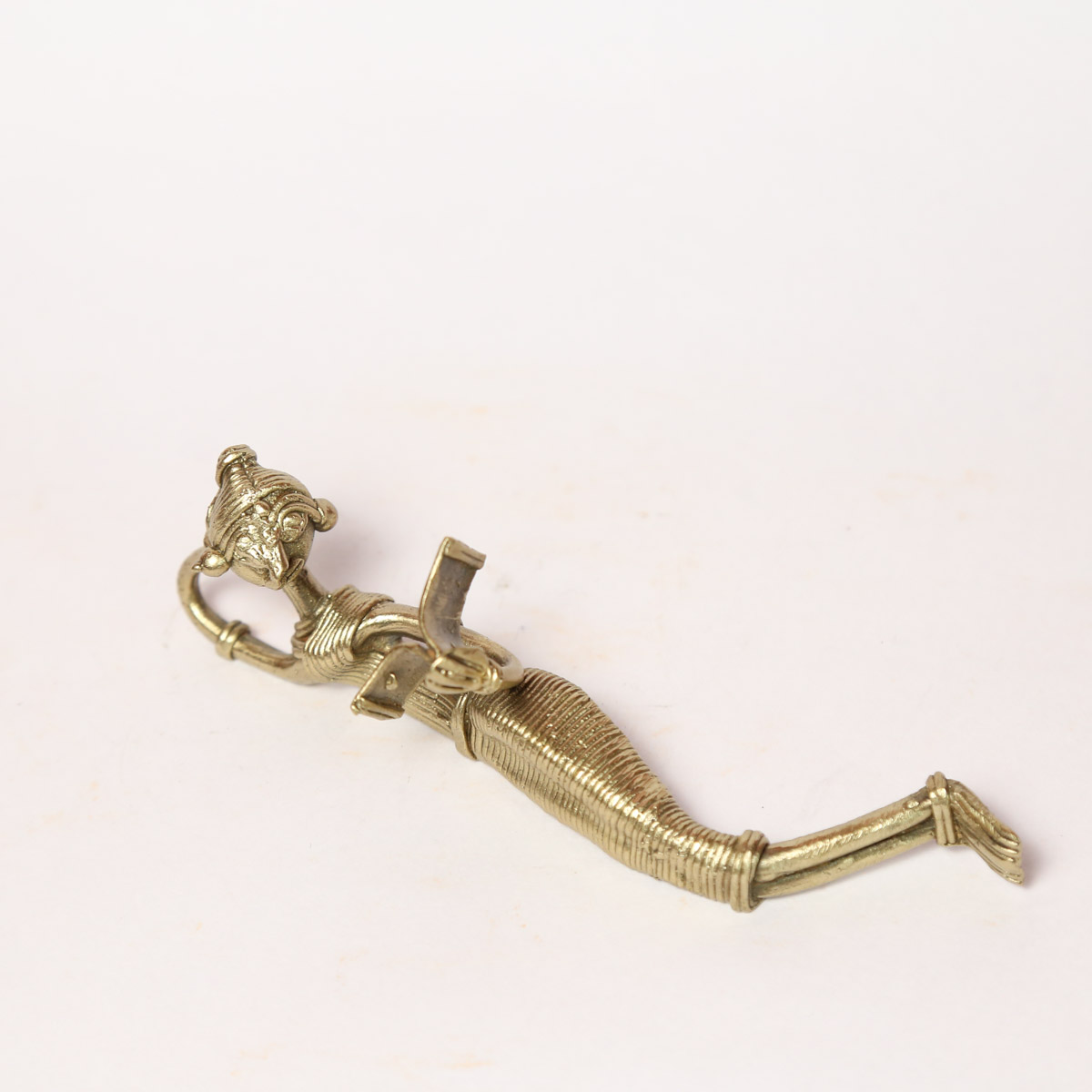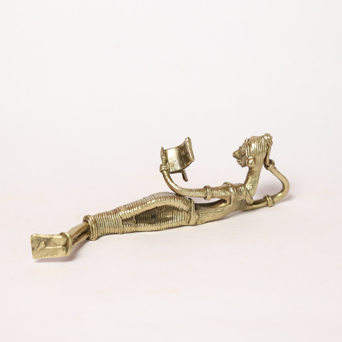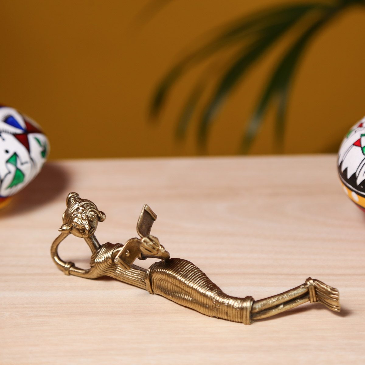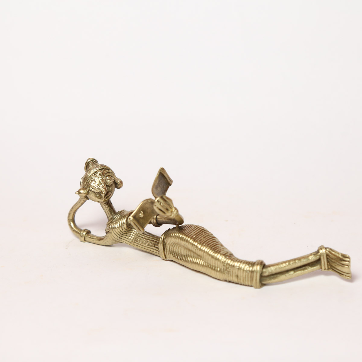 This Dhokra Figurine gets the inspiration from the tribal life of the eastern part of India and our great Dokra artisans has delicately made this figurine with love and care. This showpiece comes in golden color with antique finish and 100% handmade using the lost-wax casting technique. This brass relaxing figure is ideal to be placed at any corner of your house to spread the joy and positive vibration. The tribal woman relaxing and reading book figurine depicts the saga of Indian rich cultural heritage and legacy primitive metal craft work. This intricate art form will bring the ethnic tribal flavor in your living room.