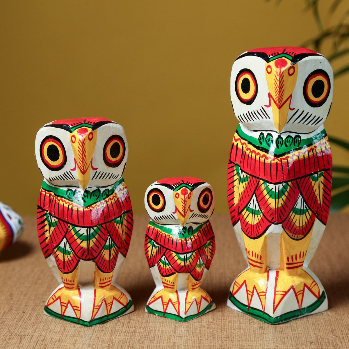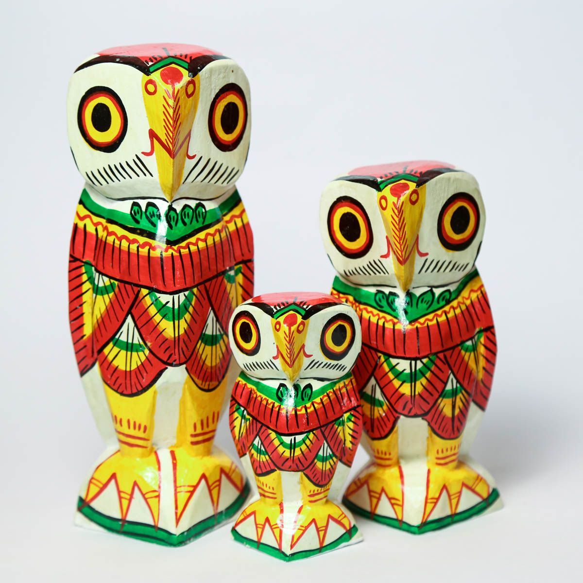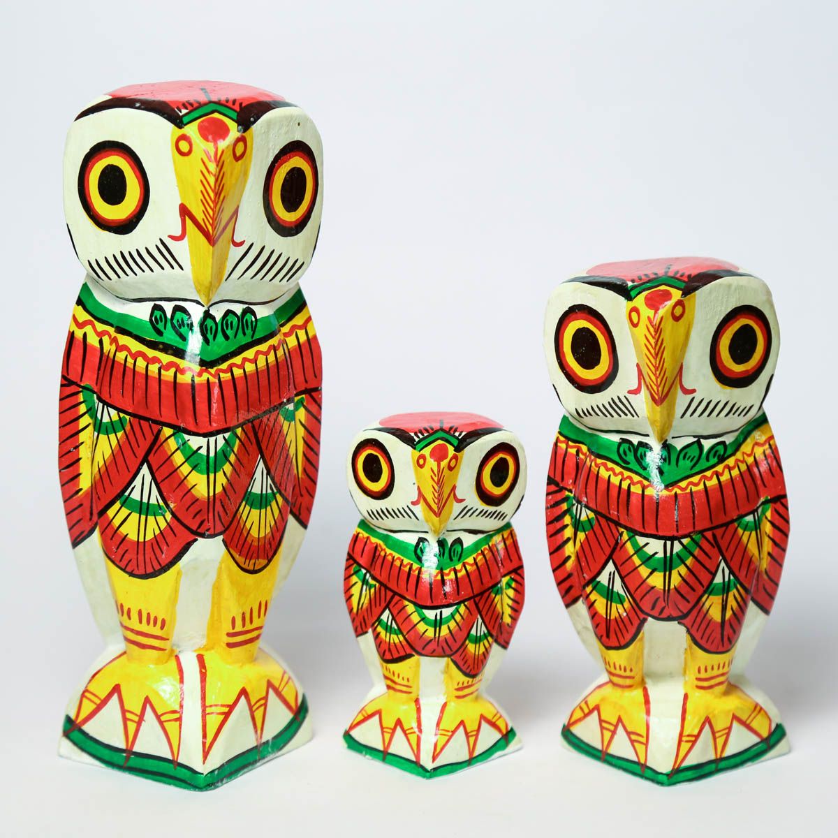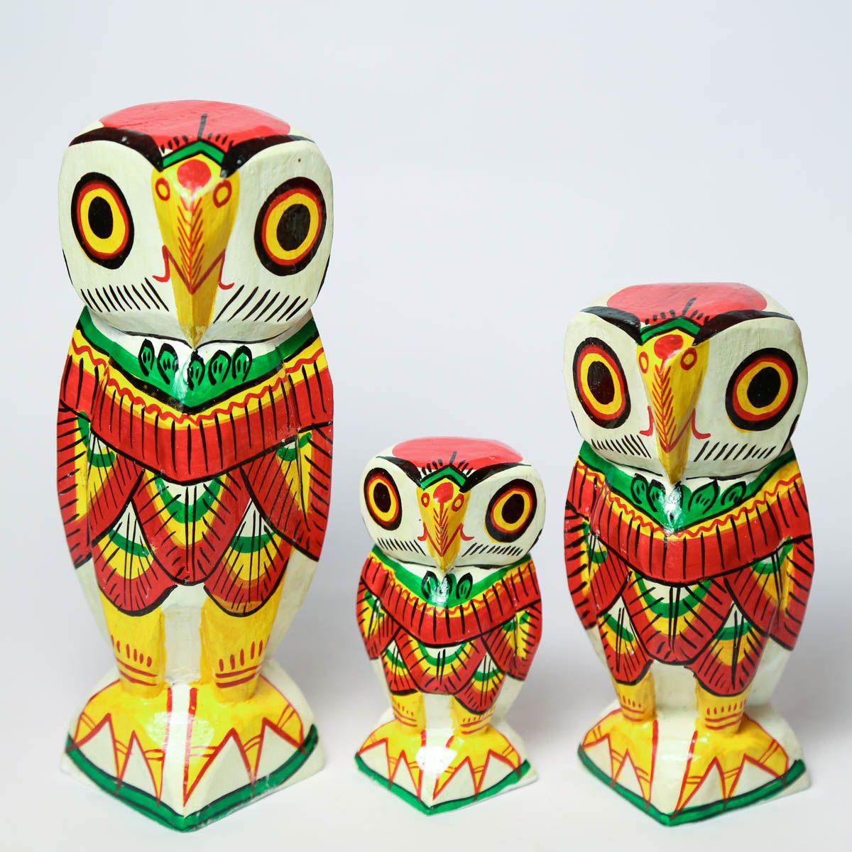 In the serenade of the black splash of the sky, the luminous stars decorated across the ocean of darkness, the nocturnal owl sits majestically as the moonlight guide its way in the dark. This wooden owl is a tribute to a creature that holds spiritual and cultural symbolism of nation. This intricate wooden curving is done by our skillful artisans of village Natungram where journey starts from wooden art & craft and ends in bringing the positivity and wisdom at your home. Usually men in the family chisel the single block of wood to create the figurines and women make those owl magically beautiful by putting bright color on it. This Owl Family set will add a essence of uniqueness at your living room.